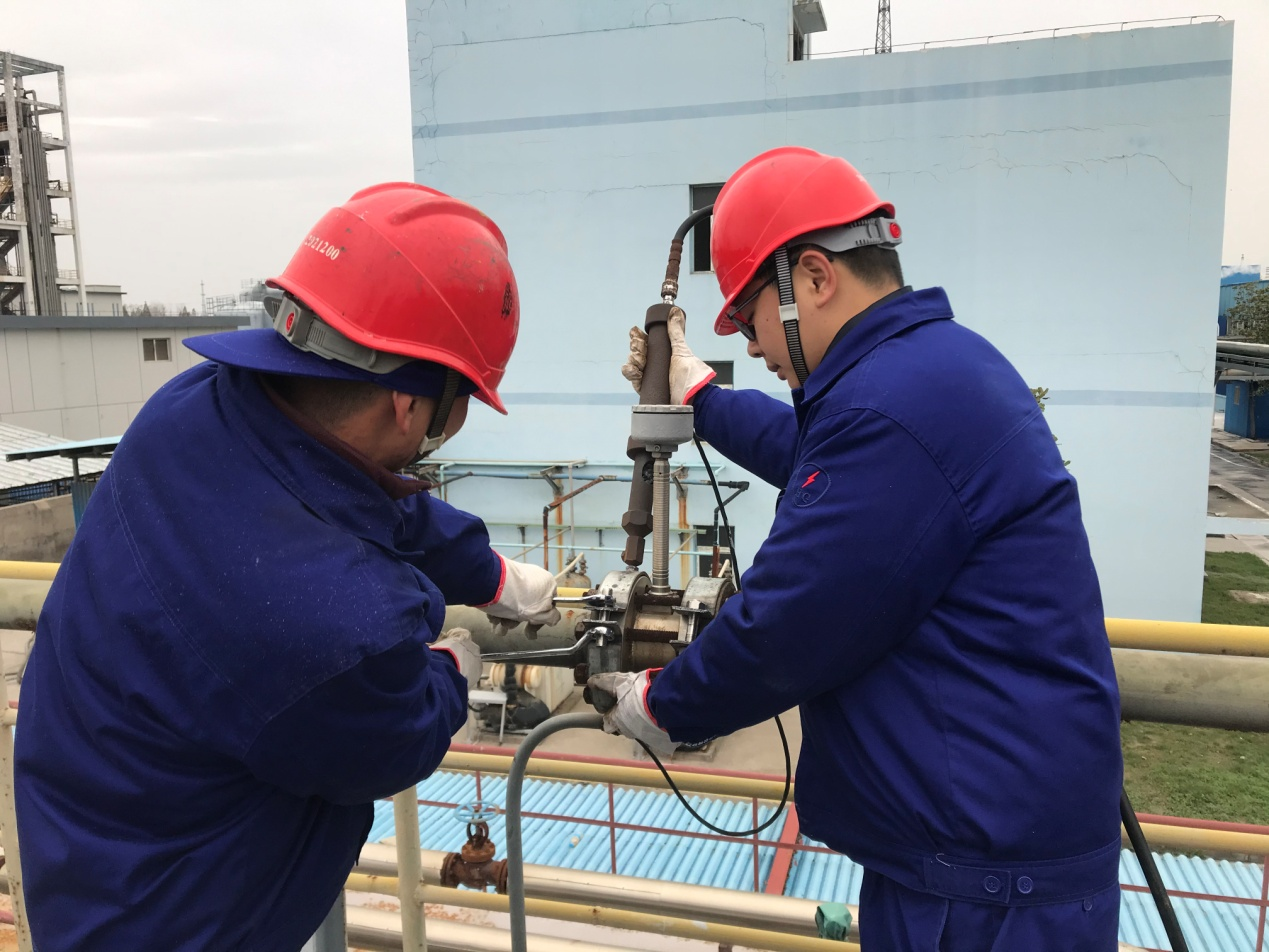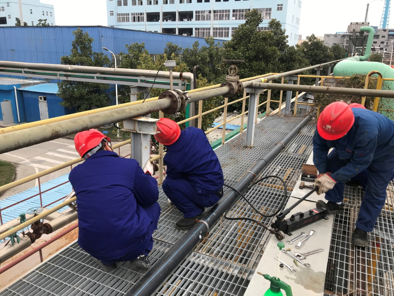 準(zhǔn)備齊全后在生產(chǎn)總監(jiān)劉年平、加氫車間主任李傳勇的帶領(lǐng)下,加氫車間堵漏搶險(xiǎn)小組按計(jì)劃前往漏點(diǎn)進(jìn)行帶壓堵漏工作,首先在漏點(diǎn)法蘭上安裝好法蘭夾,通過注劑槍往法蘭夾里注射帶壓堵漏密封膠,完成密封后進(jìn)行試漏,整個(gè)過程一氣呵成。最終在不影響供氣的情況下順利完成了帶壓堵漏工作,保障了加氫生產(chǎn)線的供氣安全。